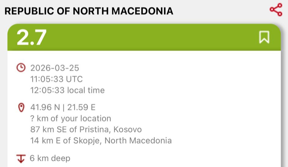 Në Maqedoni, këtë mesditë është ndjerë një tërmet, përcjell TV21. Qendra Sizmiologjike Euro-Mesdhetare e ka evidentuar tërmetin me magnitudë 2,7 ballë, në rajonin e Shkupit, konkretisht 14 km në lindje të Shkupit, me thellësi prej 6 km.